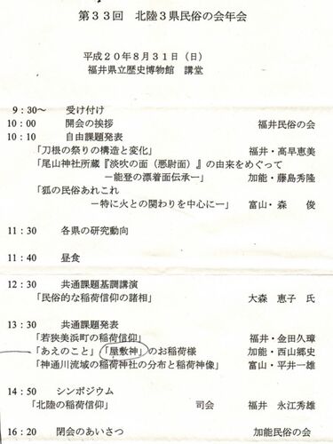 この会のために、あえのこと資料、田の神資料、屋敷神(この辺りでは「地神」なので、タイトルは切り替える)の資料を相当集め、レジメをギリギリ間に合わせた。10pB4・4枚とA4写真2枚。キーワードは「稲荷」どうして、福井まで出かけて私が発表するのか…